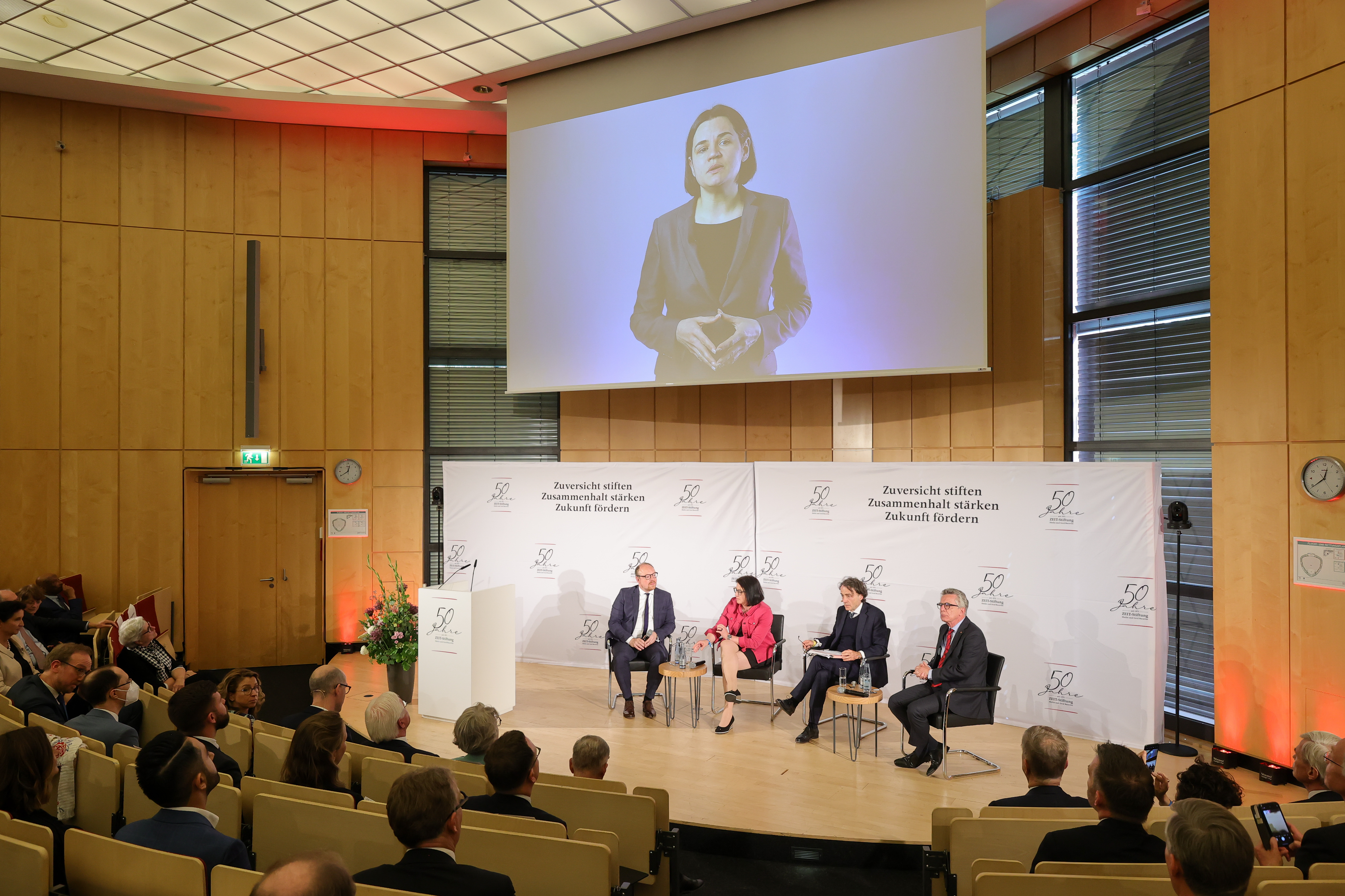 Eine, die sich unter besonders schwierigen Umständen für die Freiheit einsetzt, richtete sich in einer Videobotschaft an die Gäste: Die belarussische Oppositionelle Sviatlana Tsikhanouskaya. „Seit einem halben Jahrhundert sind sie eine treibende Kraft, die die Zivilgesellschaft unterstützt – vor allem in Osteuropa“, sage sie. Die friedlichen Proteste für mehr Demokratie in Belarus seien zwar gewaltsam niedergeschlagen worden, sie habe jedoch den Glauben an die Wirkung von Demonstrationen und Worten nicht verloren. Sie forderte die Anwesenden auf: „Erhebt auch weiterhin eure Stimme für die, die in Belarus zum Schweigen gebracht wurden.“