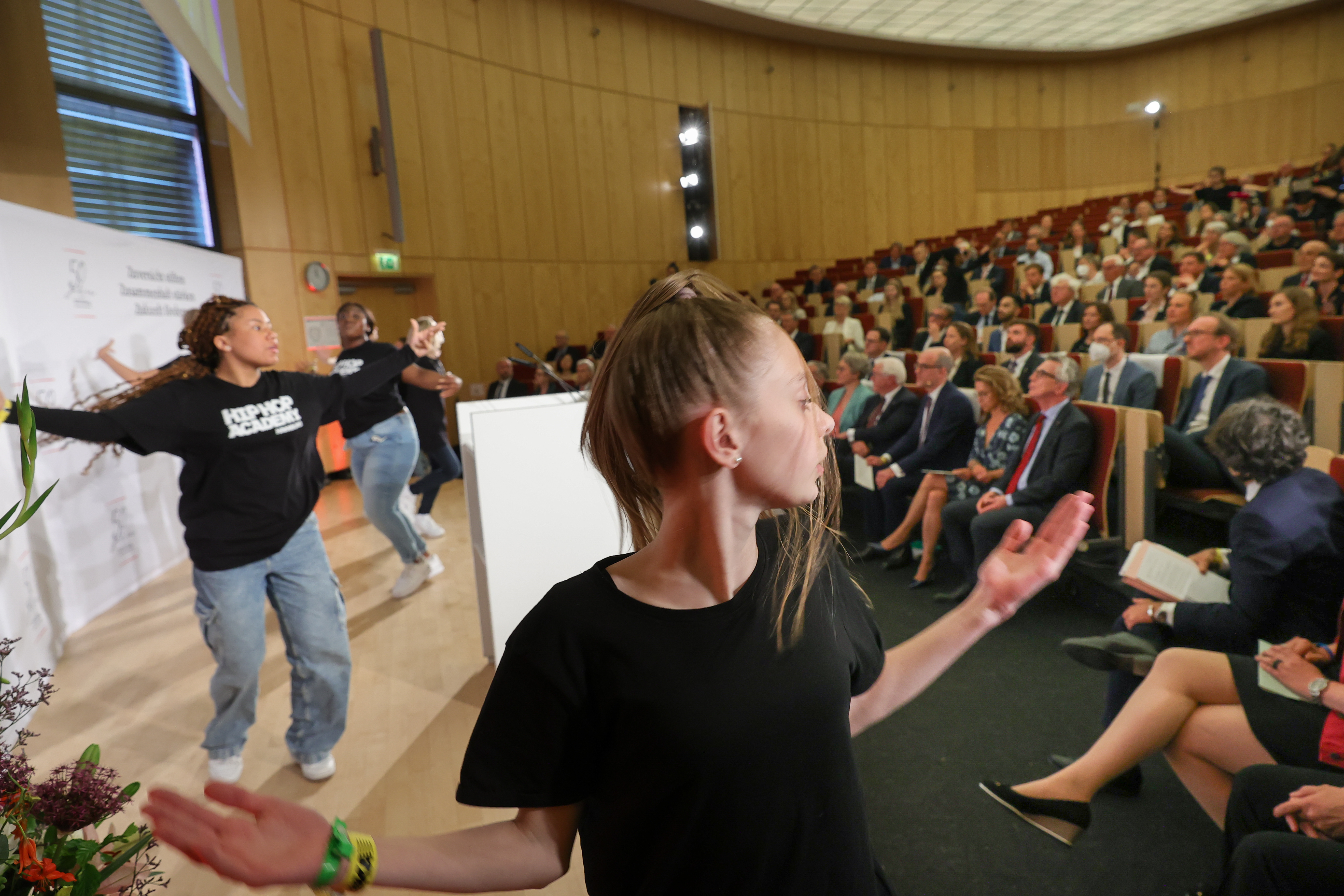 Was alle Projekte gemeinsam haben? Sie sorgen für mehr Verständnis – füreinander und für das Funktionieren unserer Gesellschaft. Und sie ermöglichen es engagierten Menschen, ihre Ideen für ein besseres Miteinander in die Tat umzusetzen. Als praktisches Beispiel, was das bewirken kann, tanzten dann Jugendliche der „HipHop Academy“ durch den Saal. Der Hintergrund des Auftritts: Die ZEIT STIFTUNG BUCERIUS fördert seit 2014 das Youngsters HipHop Camp. Jedes Jahr können dort in den Sommerferien Schüler:innen nicht nur kostenlos tanzen und rappen lernen, sondern erfahren auch viel über die Werte des HipHops: Respekt und Teamwork.