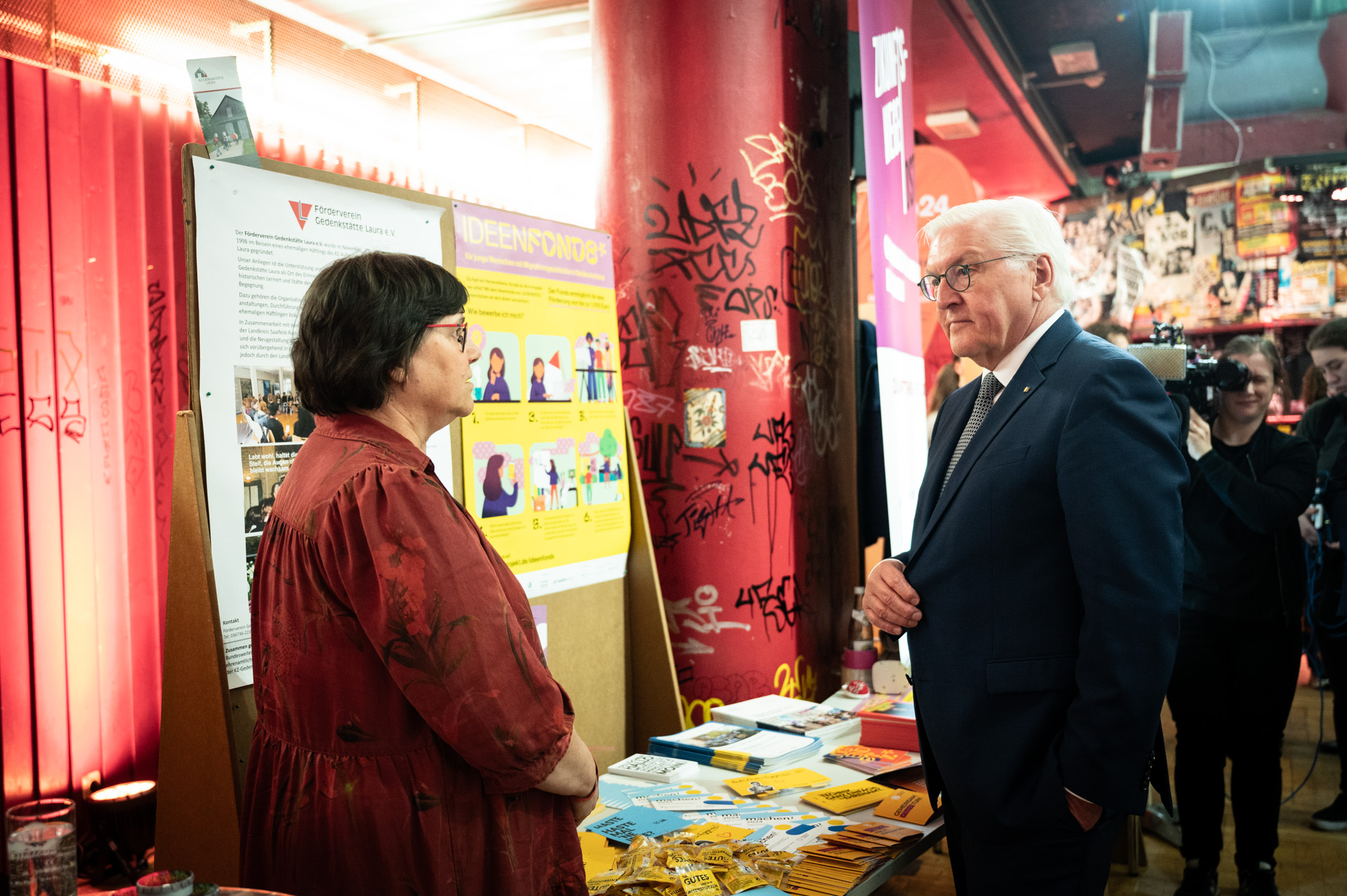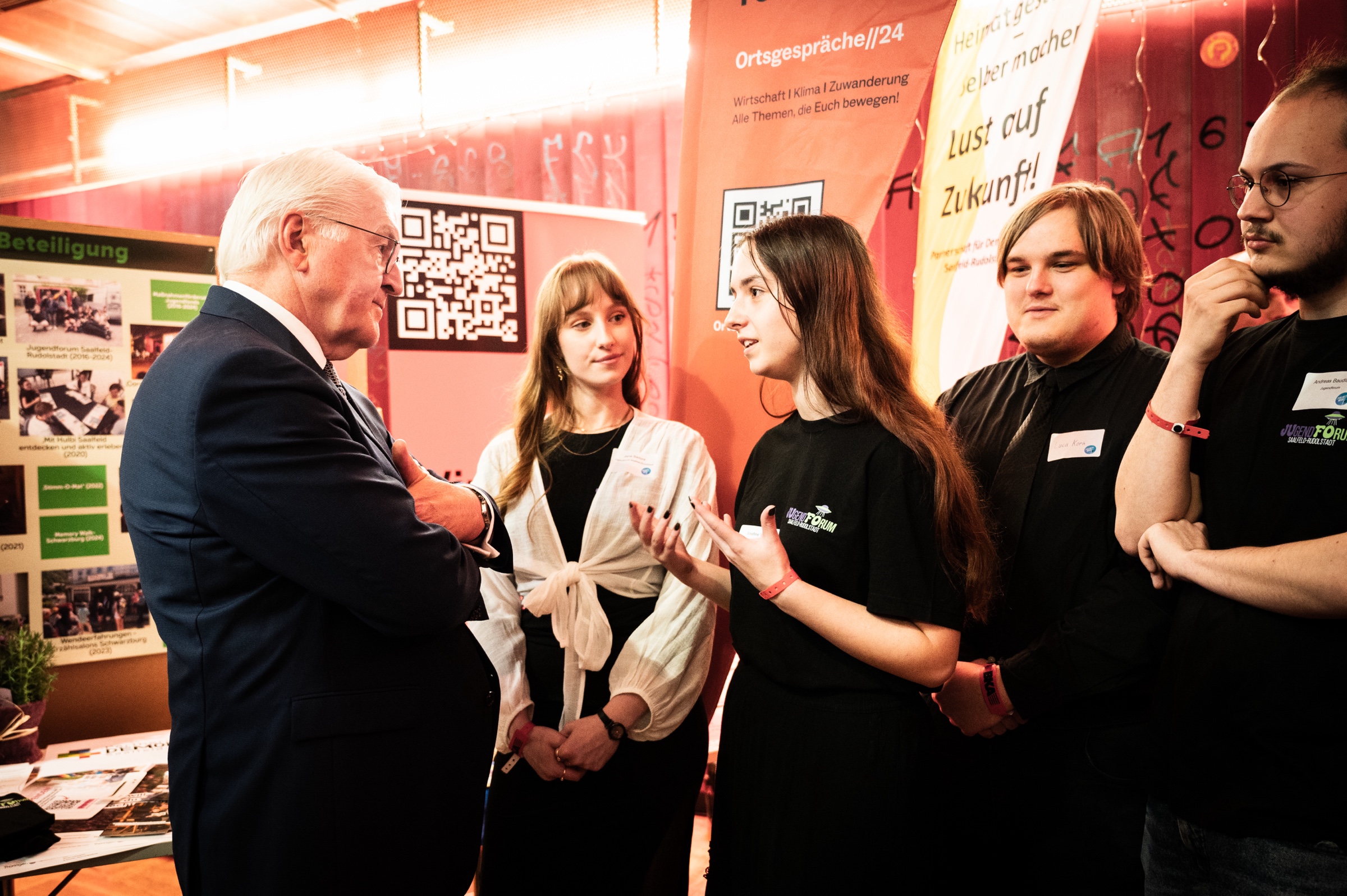 Große Aufregung und letzte Vorbereitungen bei den Jugendlichen und Mitarbeiter:innen des „Jugendforums“ im Zukunftsladen in Saalfeld: Gleich kommt Bundespräsident Frank-Walter Steinmeier. Der Bundespräsident hatte sich Zeit genommen und war zur Eröffnung der neuen Gemeinschaftsinitiative „Zukunftswege Ost“ nach Thüringen gereist. Vor dem offiziellen Startschuss für die neue Förder-Initiative wollte er die rund 15 Jugendlichen und Aktiven, wie Sebastian Heuchel von der Initiative „Partnerschaft für Demokratie Saalfeld-Rudolstadt“, zu einem Gespräch treffen, um sich über das beeindruckende Engagement für Demokratie und die Region zu informieren – fast eine ganze Stunde lang.
