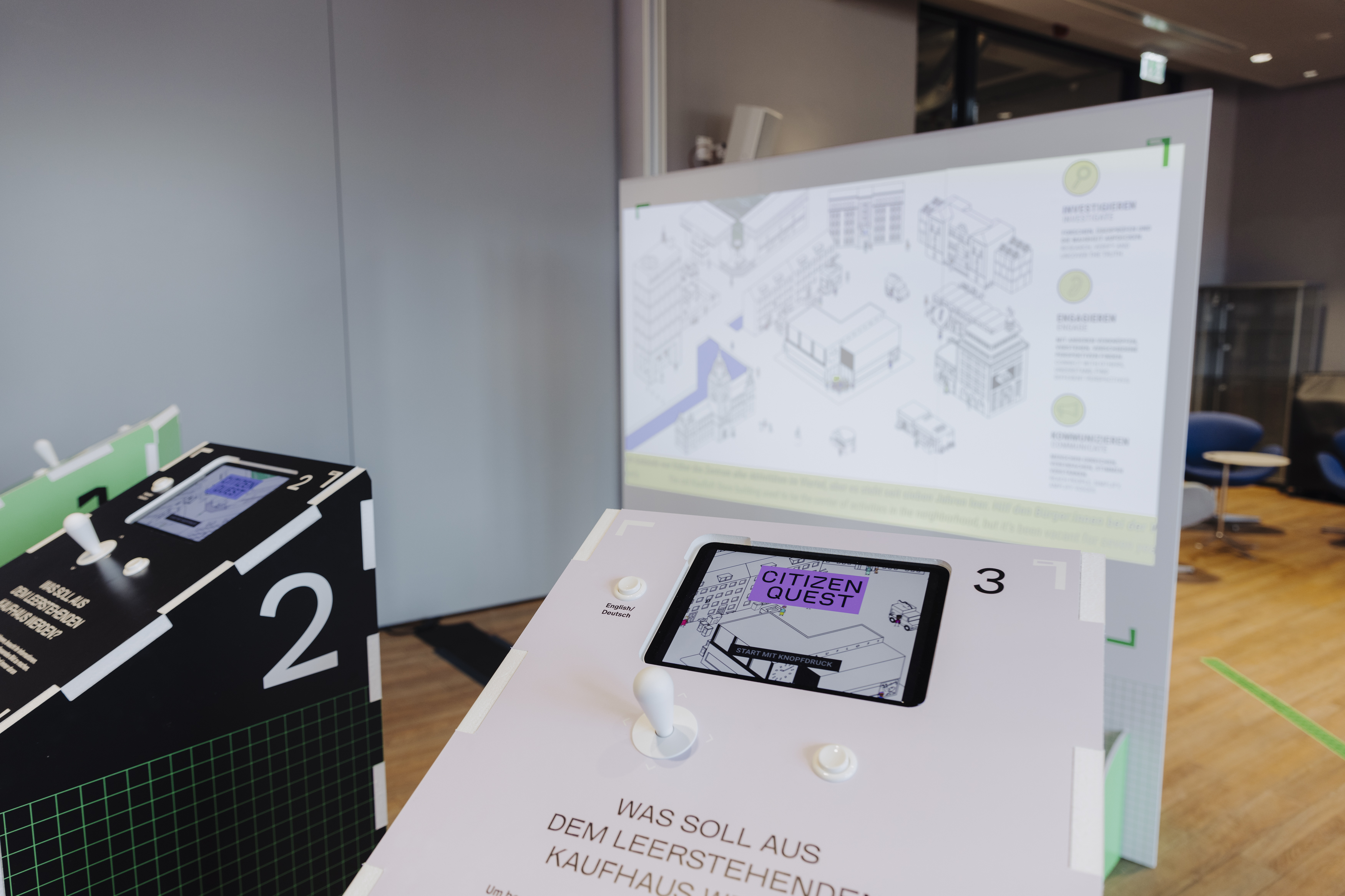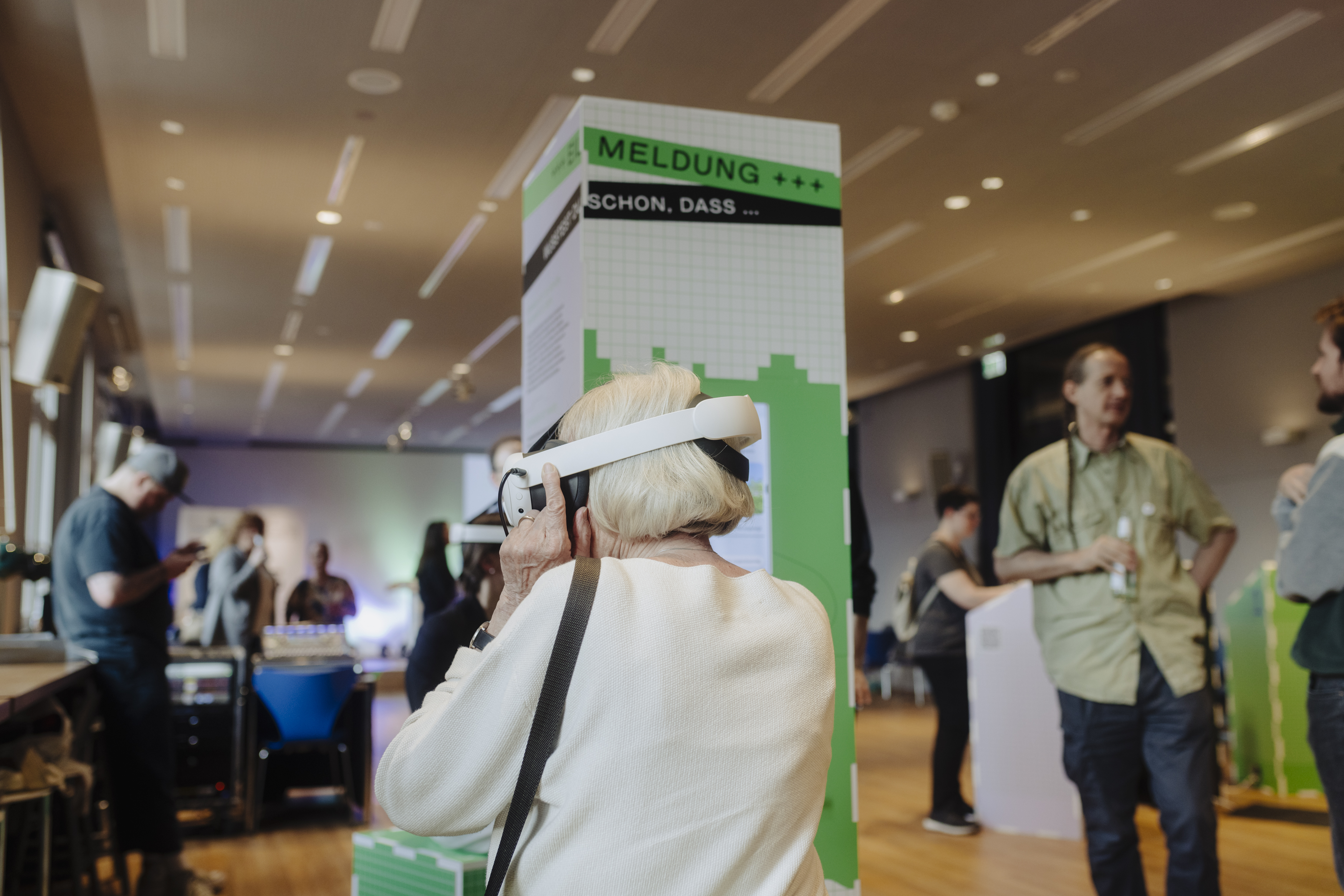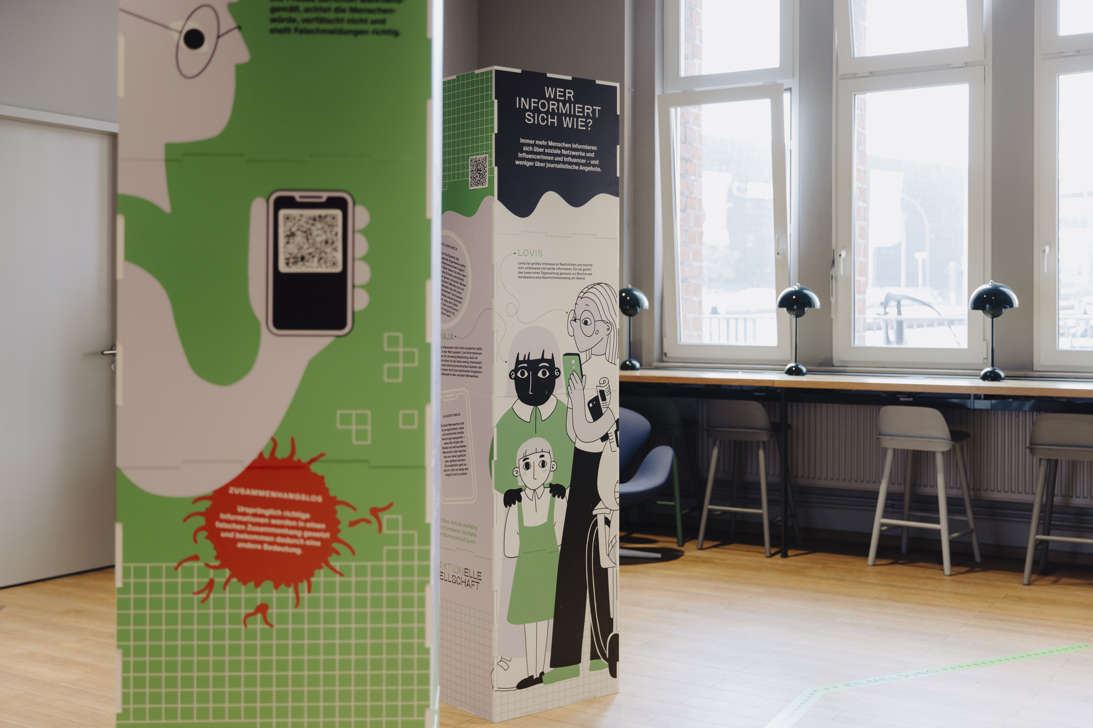 Besucher:innen können im Aktionslabor über Virtual-Reality-Brillen in ein Szenario eintauchen: Hier erfahren sie, dass Medien nie die Realität in Gänze abbilden können, sondern immer nur Ausschnitte zeigen und teilweise auch deutlich erkennbare Perspektiven einnehmen. Anschließend begeben sich die „Tester:innen“ im Labor auf die Suche nach Informationen begeben. An einer weiteren Station können Interessierte gemeinsam Aufgaben in einer fiktiven Stadt lösen: In der Stadt, die vielleicht ein wenig an Hamburg erinnert, gibt es ein leerstehendes Kaufhaus. Hier muss recherchiert und Informationen müssen überprüft werden – und die Lösung liegt nicht darin, einfach der erstbesten Quelle zu glauben. Das digitale Spiel wird dabei auf eine große Leinwand projiziert, sodass viele Menschen die Suche nach Informationen mitverfolgen können. Entwickelt wurden die Inhalte gemeinsam mit der Kreativagentur lilazwei sowie den Agenturen PlayersJourney und Imaginary.