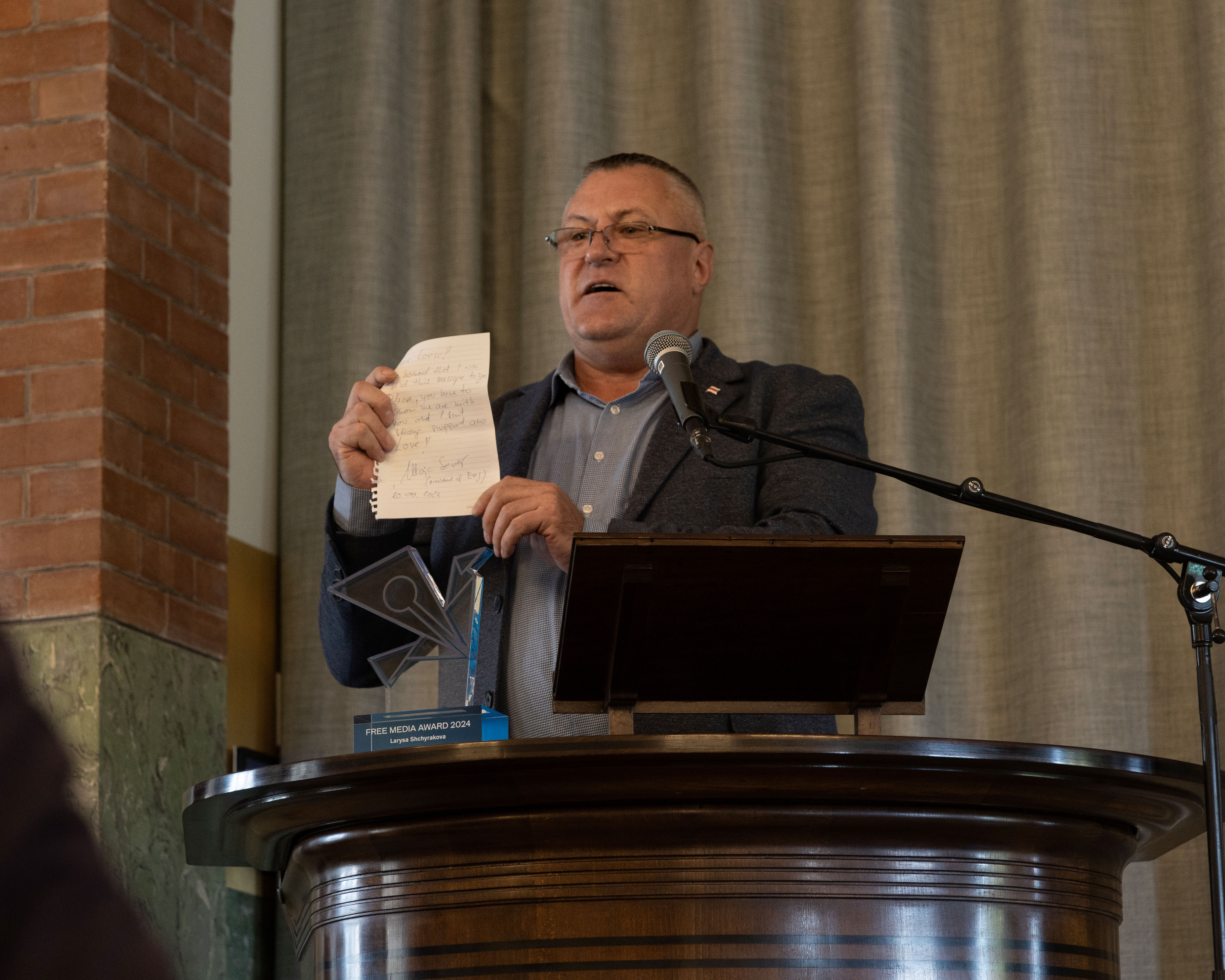 Larysa Shchyrakova ist in Belarus inhaftiert, Mikhail Afanasiev sitzt in Russland in Haft – weil sie ihrem Job nachgegangen sind. Neben Galina Arapova für Mikhail Afanasiev nimmt Leonid Sudalenko den Preis stellvertretend für Larysa Shchyrakova entgegen. Der Menschenrechtsaktivist Sudalenko war als politischer Gefangener selbst drei Jahre lang in Haft und weiß um die Bedingungen im Gefängnis: „Am heutigen Tag ist Larysa seit 651 Tagen im Frauengefängnis von Gomel inhaftiert. Die Bedingungen dort grenzen an Folter. Unsere Gedanken sind heute bei den 33 belarusischen Journalist:innen, die wie Larysa im Gefängnis sitzen, weil sie die Wahrheit über die politischen Repressionen gesagt haben.“