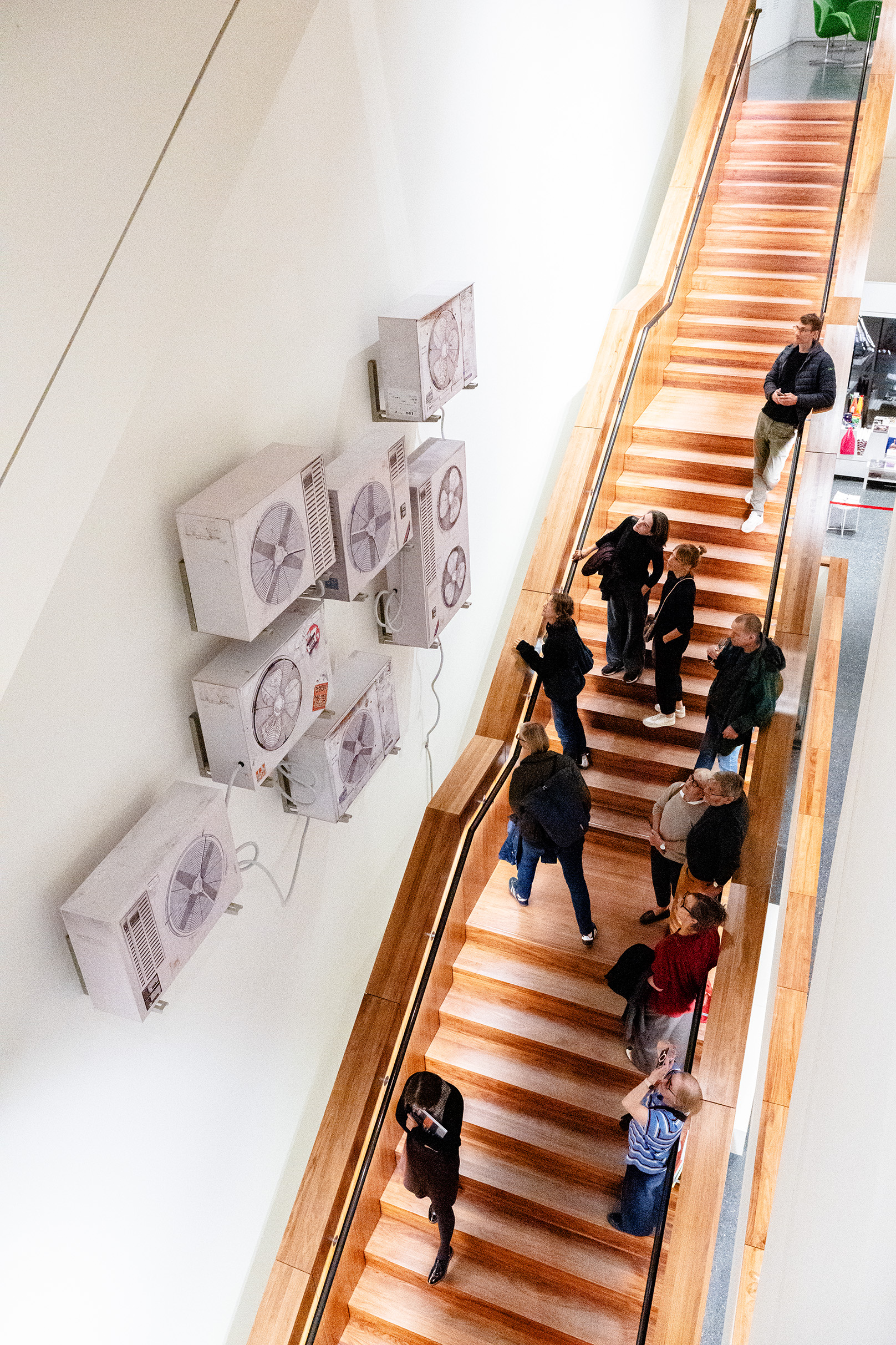 Mit Christina Köhler, auch bekannt als Tintin Patrone, hat sich nun die zweite Kunstschaffende im Rahmen der „Staircase Interventions“ dem Treppenhaus des Bucerius Kunst Forums gewidmet und es künstlerisch interpretiert. Mit mehreren Klimaanlage-Attrappen hat sie dort eine eigenwillige Klimazone geschaffen, die die Besucher:innen auf dem Weg in die Ausstellungsräume durchqueren. Patrones Kunstwerk „Condition(s)“ bezieht sich auf ein wesentliches Merkmal westlicher Ausstellungshäuser, in denen Klimaanlagen Teil einer unsichtbaren „Architektur des Wohlbefindens“ sind. In Südeuropa sowie in vielen Ländern des globalen Südens sind sie dagegen oft an Außenwänden angebracht, sind funktionale Zeichen des Alltags und werden immer lebensnotwendiger. Klimaanlagen regulieren aber nicht nur Luft, sondern auch Zugang: Indem sie die Klimaanlagen aus ihrer Verkleidung hervorholt und sie als skulpturale Körper exponiert, will Tintin Patrone Schichten institutioneller Kontrolle offenlegen – über Luft und Raum, aber auch über Wahrnehmung, Geschmack und Deutungshoheit.
