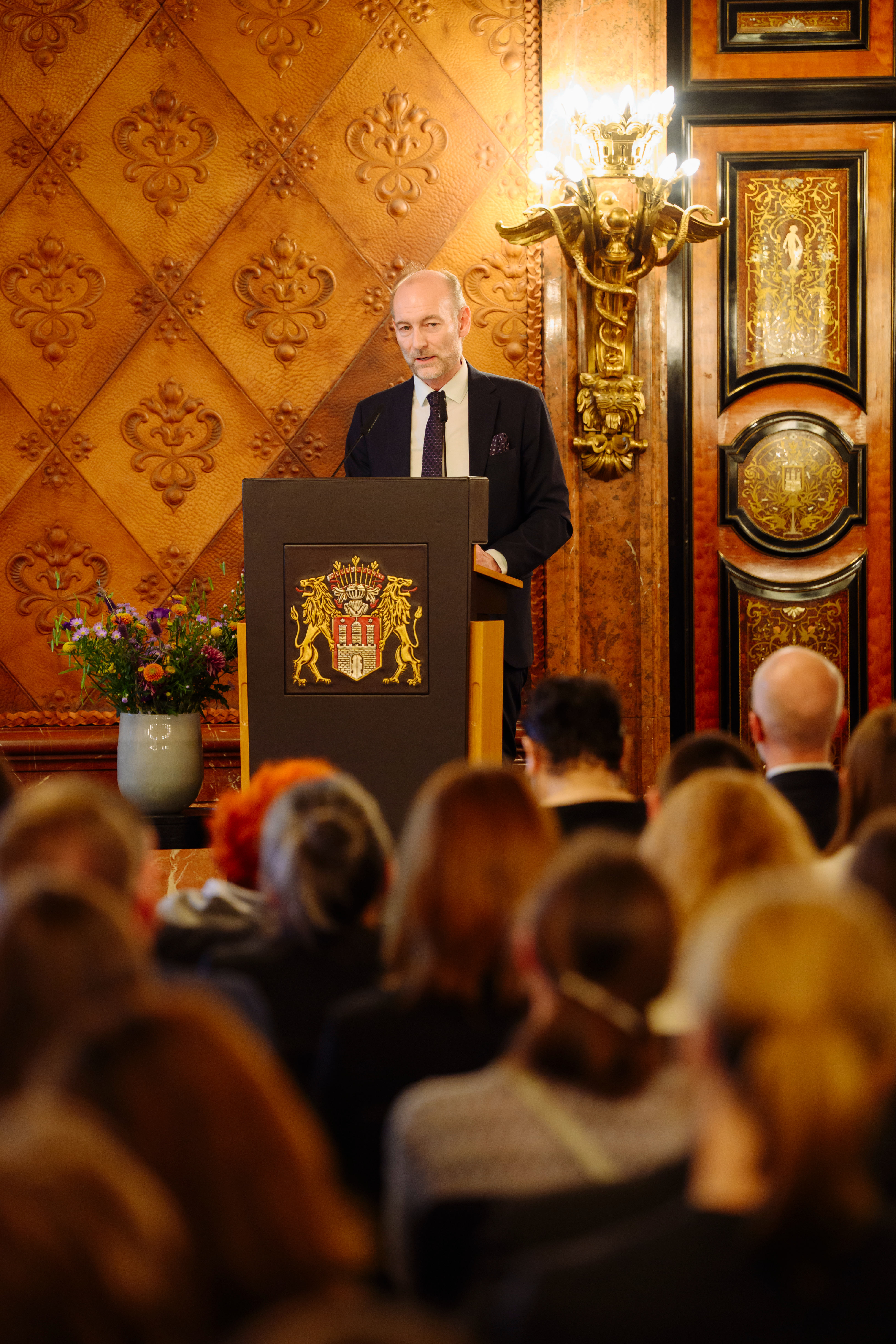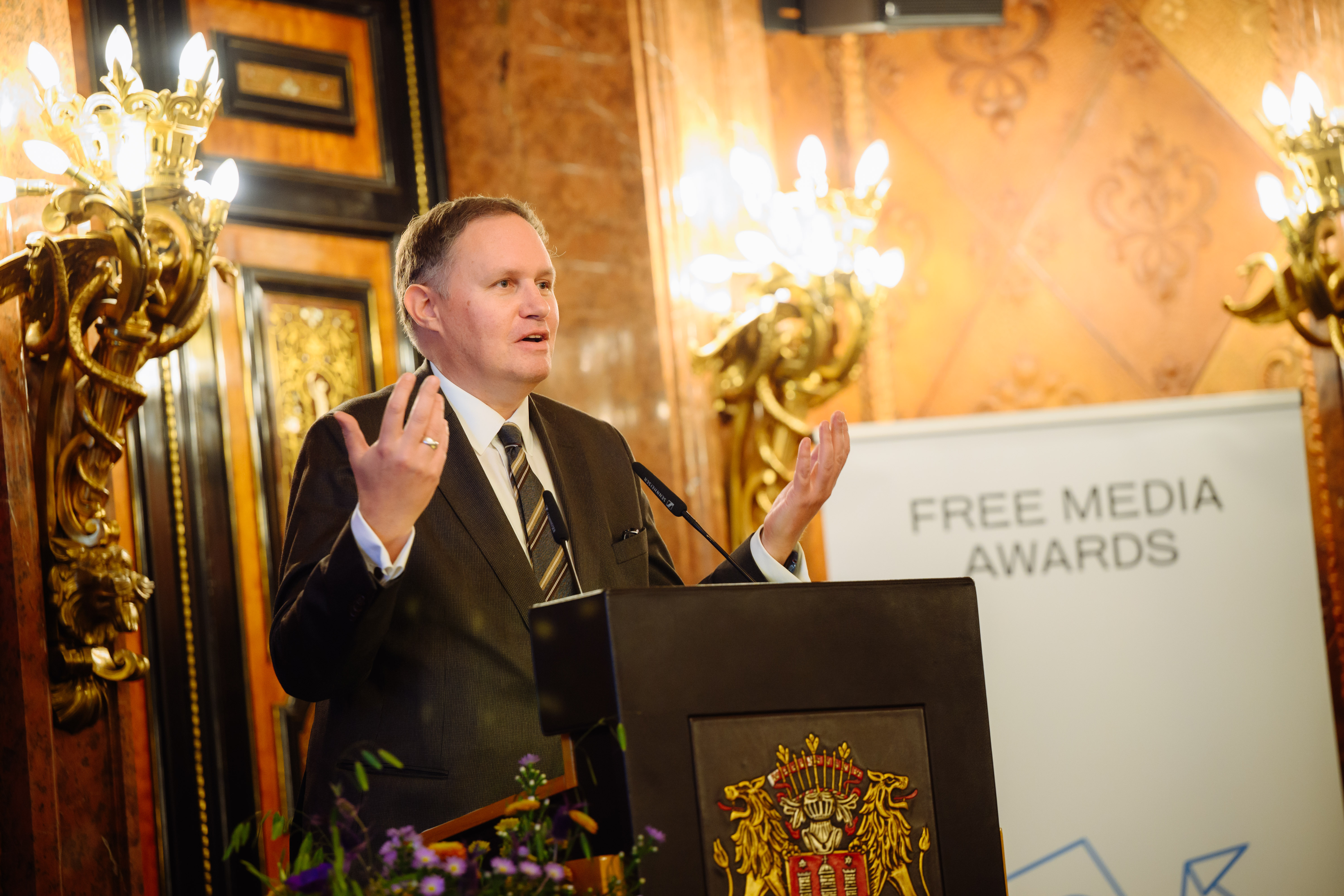 „Wir sind heute hier, weil Sie hier sind“, sagt dann Dagmar Reim, Kuratoriumsmitglied der ZEIT STIFTUNG BUCERIUS, in ihrer Begrüßung im Anschluss an einleitende Worte des Hamburger Kultursenators Carsten Brosda, und wendet sich an die Preisträger:innen. „Von Ihnen fühlen wir uns ermutigt, weil Sie niemals müde werden, weil Sie niemals den Mut verlieren, weil Sie niemals aufgeben.“ Mut, Resilienz und der Wille, ein Risiko auf sich zu nehmen, welches Millionen von Menschen nie eingehen werden – es ist dieser beispiellose Einsatz für die Pressefreiheit, den wir Stiftungen seit 2006 mit der Verleihung der Free Media Awards hervorheben und wertschätzen wollen. „Die Preisträger:innen der Free Media Awards dokumentieren Vorfälle, die die Demokratie herausfordern: Korruption, Staats- und Kriegsverbrechen, Menschenrechtsverletzungen, Machtmissbrauch, Desinformation, Propaganda, Kriegsberichterstattung“, benennt Knut Olav Amas, Executive Director von Fritt Ord, diesen Verdienst. „Transparenz, Vertrauen, Wahrheit – das sind Ihre Werte als Journalist:innen.“
