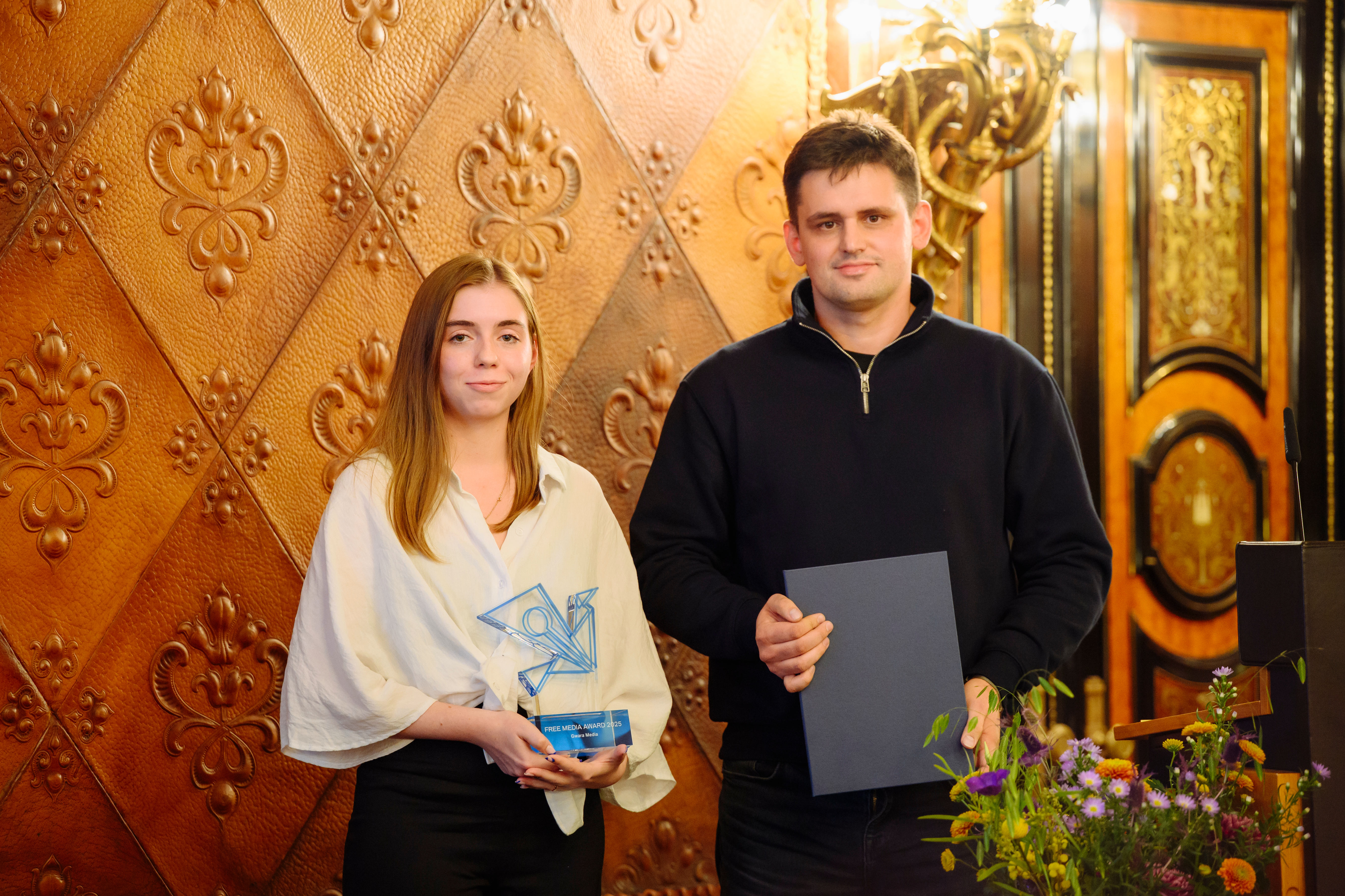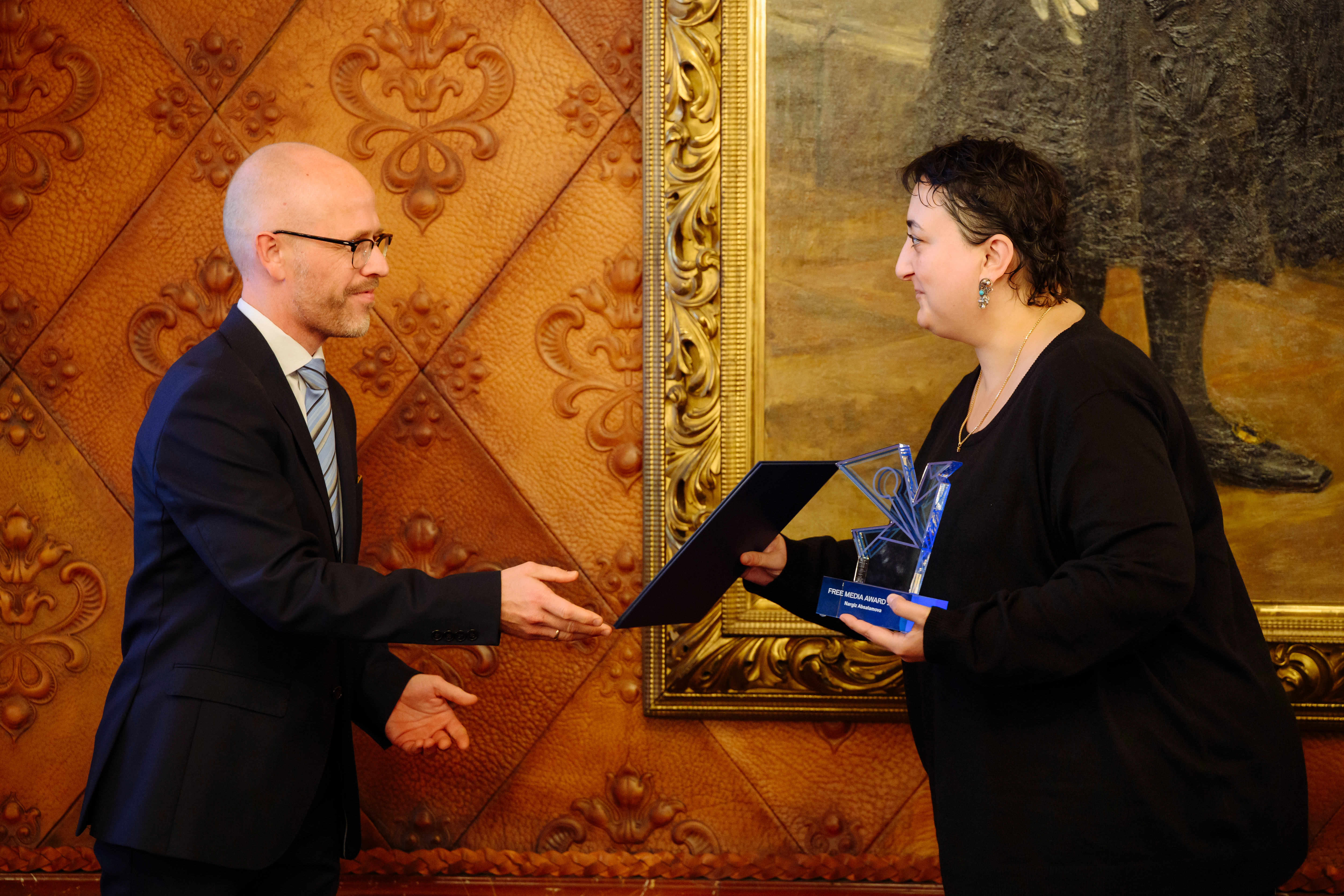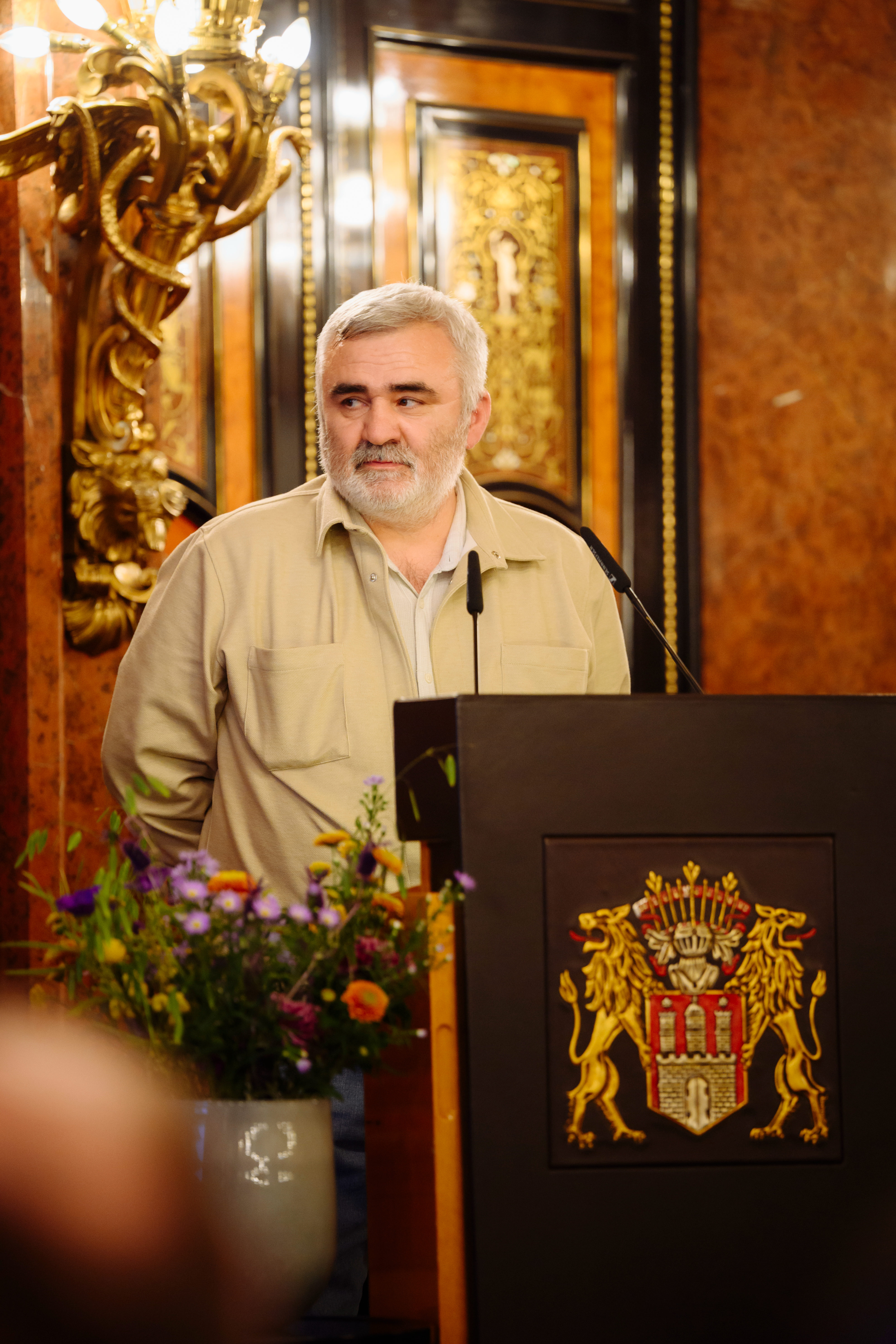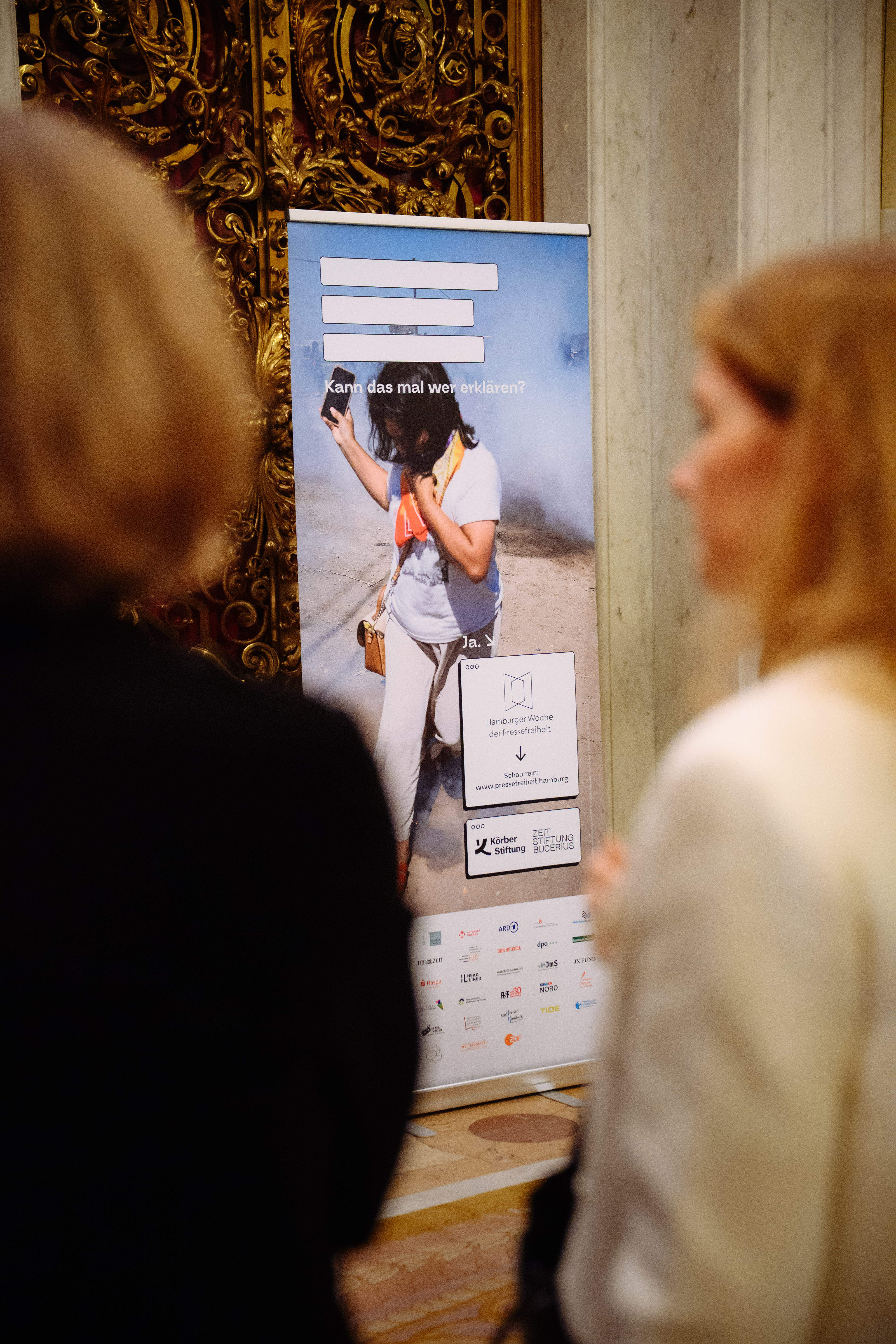 Während sich die untergehende Sonne noch in den hohen Fenstern des Hamburger Rathauses spiegelt, kommen sie im eindrucksvollen Kaisersaal zusammen: Die Preisträger:innen der Free Media Awards 2025. Sie selbst oder ihre Vertreter:innen sind aus Aserbaidschan, der Ukraine, Georgien, Ungarn, Belarus und Russland angereist, um an diesem Abend den Preis für unabhängige Berichterstattung in Osteuropa und Russland entgegenzunehmen, verliehen von uns als ZEIT STIFTUNG BUCERIUS und der norwegischen Stiftung Fritt Ord. 2025 ehren wir damit die mutige Arbeit von Nargiz Absamalova (Aserbaidschan), Gwara Media (Ukraine), Mzia Amaglobeli (Georgien), Direkt36 (Ungarn), des Belarusian Investigative Center (Belarus) und von Alexandra Astakhova (Russland). Arbeit, die sie unter zum Teil lebensbedrohlichen Bedingungen ausführen, teils im Exil, unter starkem politischem Druck und der Beobachtung von repressiven Regimen. Zwei der Preisträger:innen, Absamalova und Amaglobeli, sind in Aserbaidschan und Georgien aktuell aufgrund ihrer Arbeit inhaftiert und können den Preis nicht persönlich entgegennehmen. Ihren Vertreter:innen und den weiteren Preistragenden hören an diesem Abend zahlreiche Gäste gebannt zu: andere Journalist:innen, Förder:innen und Interessierte sind im Kaisersaal zusammengekommen, um den Kampf für freie Berichterstattung zu ehren. Durch den Abend führt Alice Bota, Jurymitglied der Free Media Awards und Journalistin für DIE ZEIT, begleitet von Musiker Leonard Stanoschefsky am Kontrabass, Stipendiat der Gerd Bucerius-Stipendien der Deutschen Stiftung Musikleben.