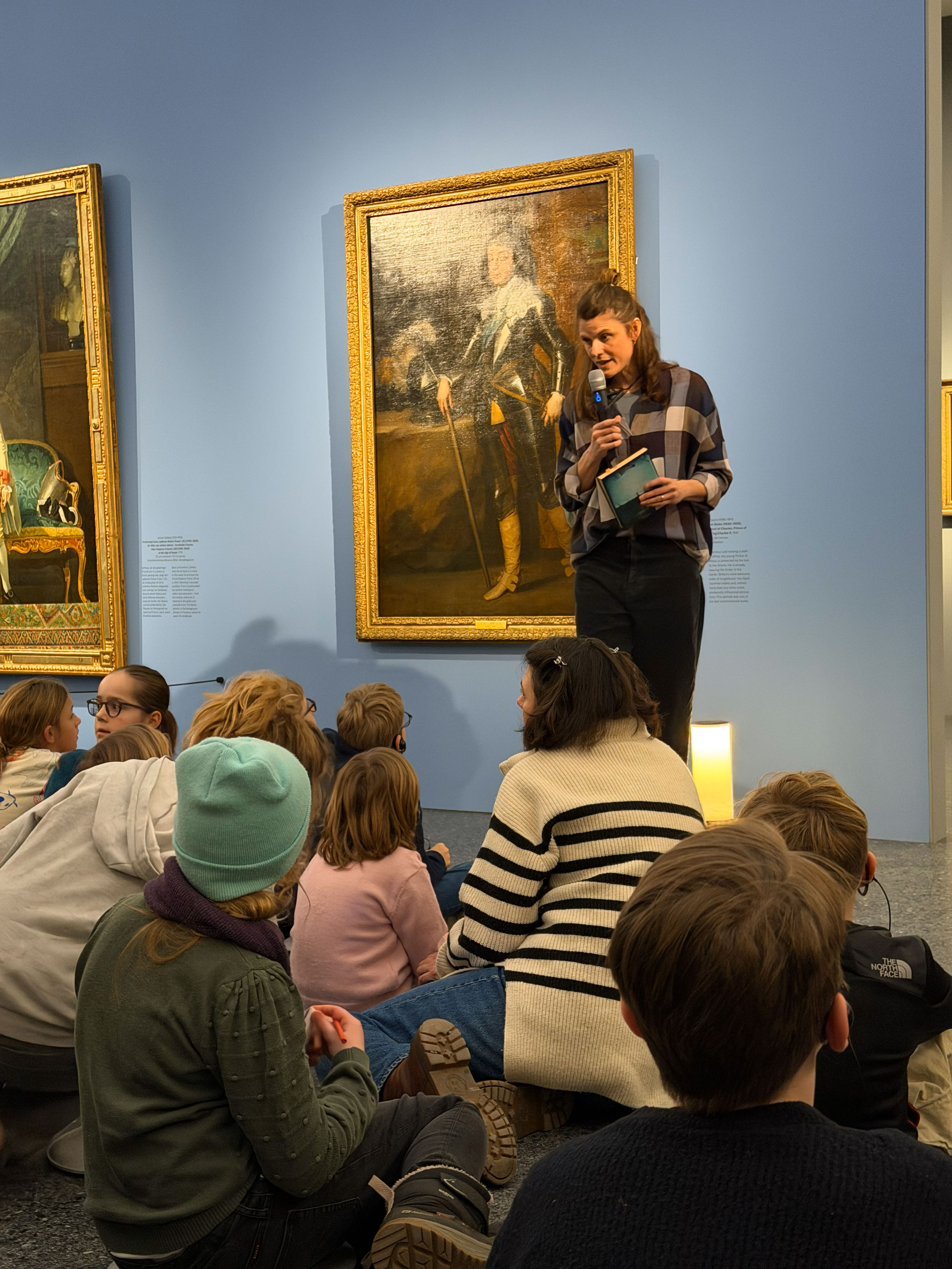 Das Format, genannt „Sitzkissenlesung“, entstand als Kooperation zwischen uns als ZEIT STIFTUNG BUCERIUS, dem Jungen Literaturhaus sowie dem von uns getragenen Ausstellungshaus. Ziel war es, einerseits kindgerecht in die Themen der Ausstellung „Kinder, Kinder!“ einzuführen, etwa wie unterschiedlich Kindheit über die Jahrhunderte wahrgenommen wurde, welche Machstrukturen in Kinderdarstellungen offengelegt, welche Signale gesendet werden sollten. Vor allem aber sollte die Begegnung mit Kunstschaffenden und ihrem Werk, umrahmt von künstlerisch verewigten Altersgenoss:innen, Fantasie und Kreativität anregen, kurzum: Lust auf Kunst machen. Das war ein Experiment, zumal im laufenden Betrieb am Wochenende. Und es ist gelungen: Die Veranstaltung war in kurzer Zeit ausgebucht. Alle Kinder, überwiegend im Grundschulalter, widmeten ihre volle Aufmerksamkeit über 90 Minuten den gleichermaßen spannenden wie zugewandten Vorträgen der Kinderbuchautor:innen, die ihnen per Kopfhörer ins Ohr übertragen wurden.