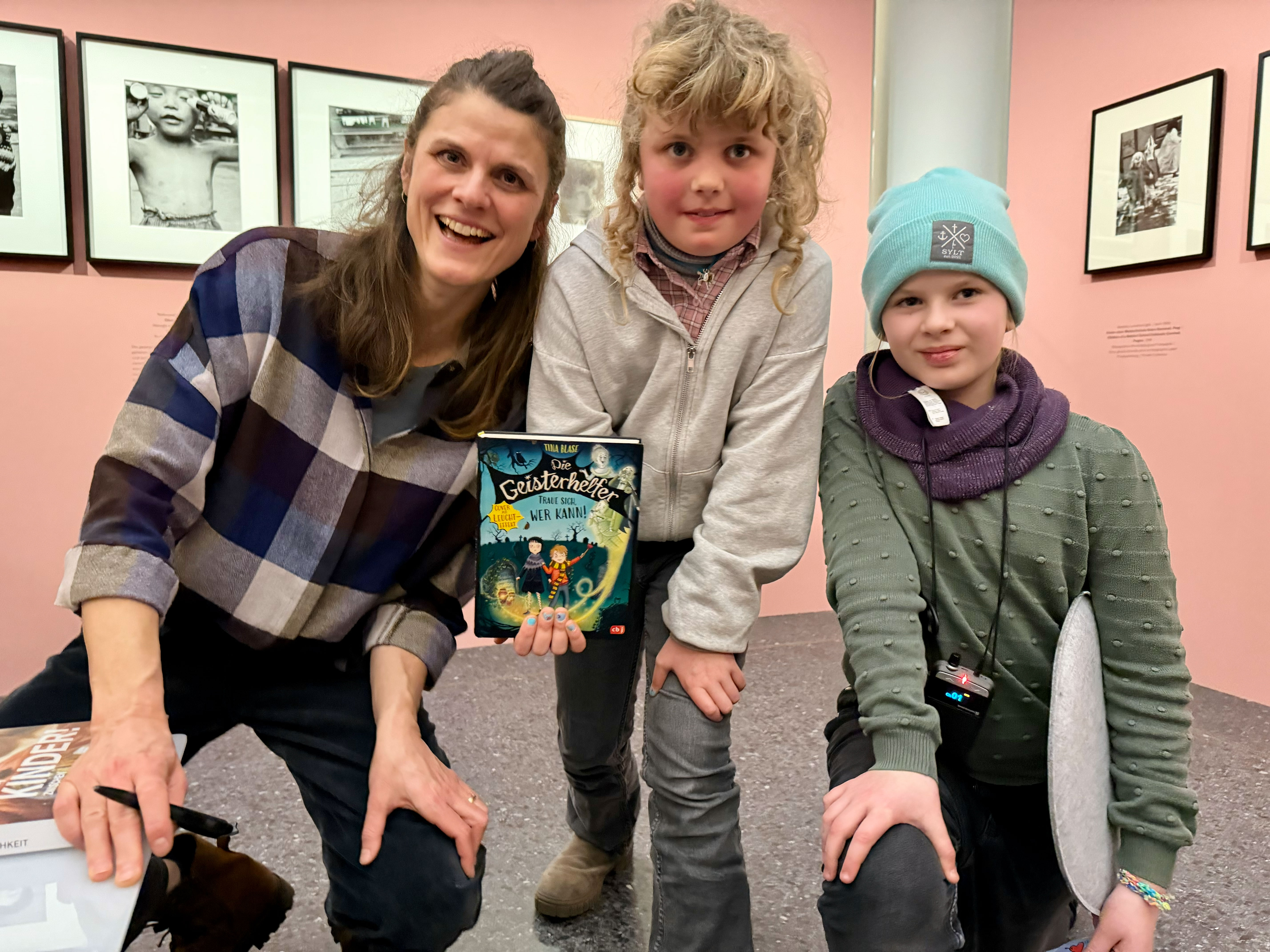 Vor der Lesung führte Dr. Katrin Dyballa, Kuratorin von „Kinder, Kinder!“, in die Ausstellung ein. Hinterher wurden Autogramme verteilt und mitgebrachte Bücher signiert – ganz wie bei Lesungen für Erwachsene. Befragte Kinder sprachen einhellig von einem sehr guten Nachmittagserlebnis, das Lust auf die vorgestellten Bücher geweckt habe. In Erinnerung bleiben das Bild der Ruhe, Konzentration und Begeisterung, mit der die große Gruppe bei der Sache war; und die erneuerte Erkenntnis, wie wertvoll Kinderliteratur und -poesie ist: um Fantasie zu entfalten, Gefühlswelten und Erfahrungen in spannenden Geschichten zu spiegeln – und Mut zu machen, sich zu entwickeln und zu wachsen.
