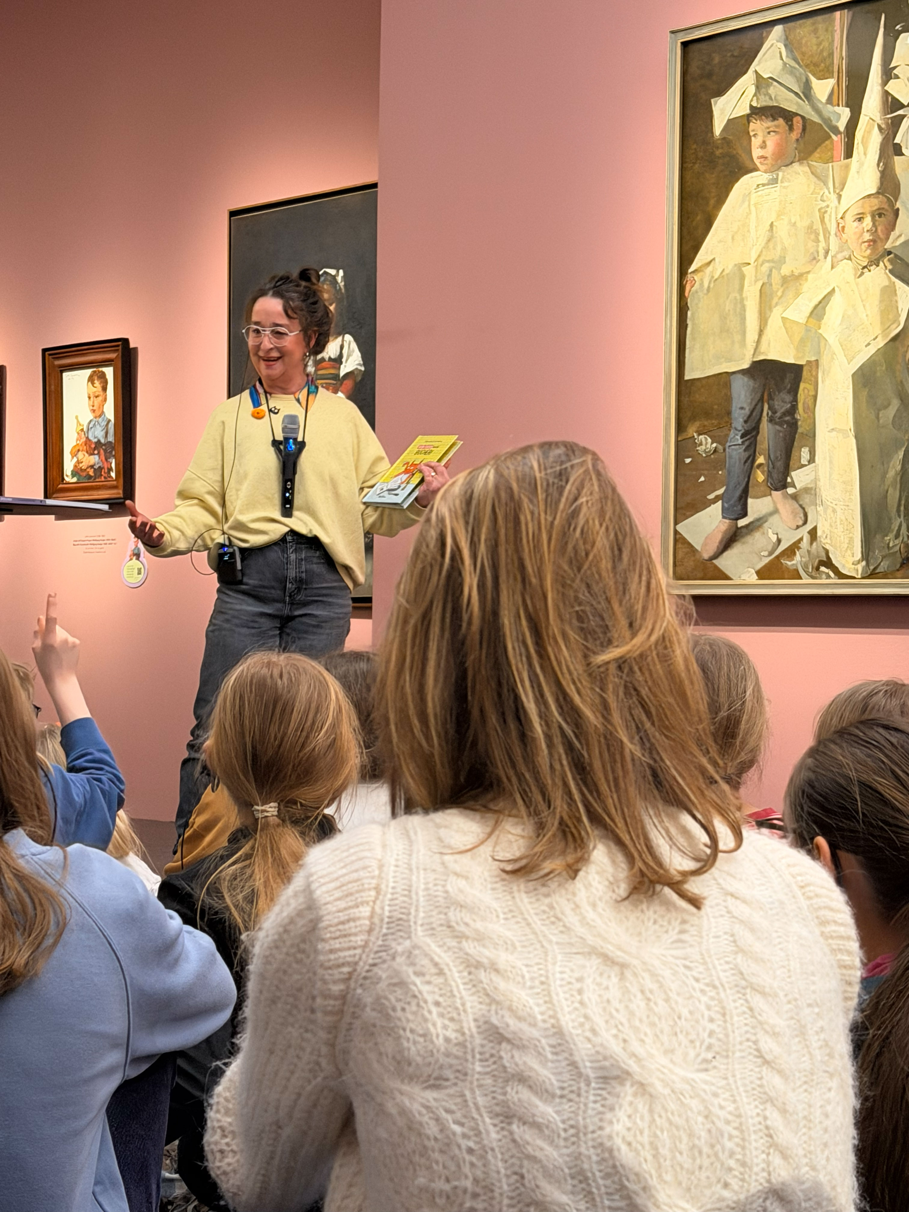 Das Format, genannt „Sitzkissenlesung“, entstand als Kooperation zwischen uns als ZEIT STIFTUNG BUCERIUS, dem Jungen Literaturhaus sowie dem von uns getragenen Ausstellungshaus. Ziel war es, einerseits kindgerecht in die Themen der Ausstellung „Kinder, Kinder!“ einzuführen, etwa wie unterschiedlich Kindheit über die Jahrhunderte wahrgenommen wurde, welche Machstrukturen in Kinderdarstellungen offengelegt, welche Signale gesendet werden sollten. Vor allem aber sollte die Begegnung mit Kunstschaffenden und ihrem Werk, umrahmt von künstlerisch verewigten Altersgenoss:innen, Fantasie und Kreativität anregen, kurzum: Lust auf Kunst machen. Das war ein Experiment, zumal im laufenden Betrieb am Wochenende. Und es ist gelungen: Die Veranstaltung war in kurzer Zeit ausgebucht. Alle Kinder, überwiegend im Grundschulalter, widmeten ihre volle Aufmerksamkeit über 90 Minuten den gleichermaßen spannenden wie zugewandten Vorträgen der Kinderbuchautor:innen, die ihnen per Kopfhörer ins Ohr übertragen wurden.
