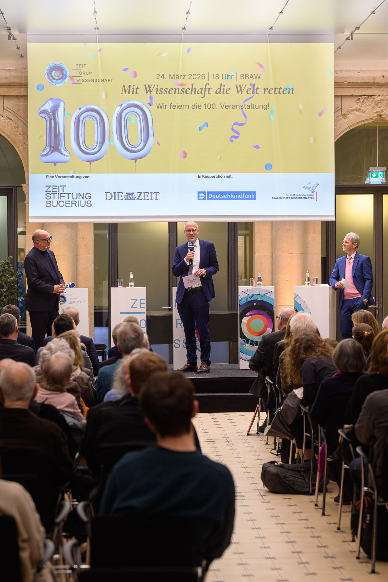 Mit diesem Geist der Veränderungen im Rücken erfährt auch das „ZEIT Forum Wissenschaft“ als Format einige Veränderungen, die Niels von der Kall, neuer CEO der ZEIT Verlagsgruppe, und Stefan Raue, Intendant des Deutschlandfunks, zum Abschluss des Abends vorstellten. So wird das „ZEIT Forum Wissenschaft“ weiterhin von der Berlin-Brandenburgischen Akademie der Wissenschaften begleitet, zieht mit der 101. Ausgabe aber an einen neuen Ort: das Humboldt-Forum. Dieser Raum erlaubt dem Format, sich noch dialogischer auszurichten und Partizipation des Publikums stärker in die Programmgestaltung einzubeziehen. Neu sein wird auch die Moderationskonstellation: Andreas Sentker verabschiedet sich aus der Live-Moderation des Formats und übergibt den Stab an seine ZEIT-Kolleginnen Anna-Lena Scholz und Sibylle Anderl, die in Zukunft gemeinsam mit Ralf Krauter und der ebenfalls dazustoßenden Katrin Kühn vom Deutschlandfunk, moderieren werden. Für den ZEIT-Wissen-Leiter Sentker bedeutete das Jubiläum nach rund 25 Jahren der Live-Moderation einen großen Abschied und bewegende Dankesworte, auch seitens der Partner:innen der ZEIT STIFTUNG BUCERIUS, der BBAW, des Deutschlandfunks und Holtzbrinck Berlins, die das Format seit der ersten Stunde operativ betreuen und durchführen. Die erste Ausgabe im Humboldt-Forum findet am 10. Juni 2026 statt, mehr dazu bald in unserem Veranstaltungskalender.